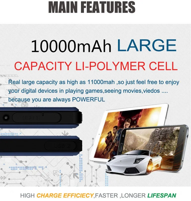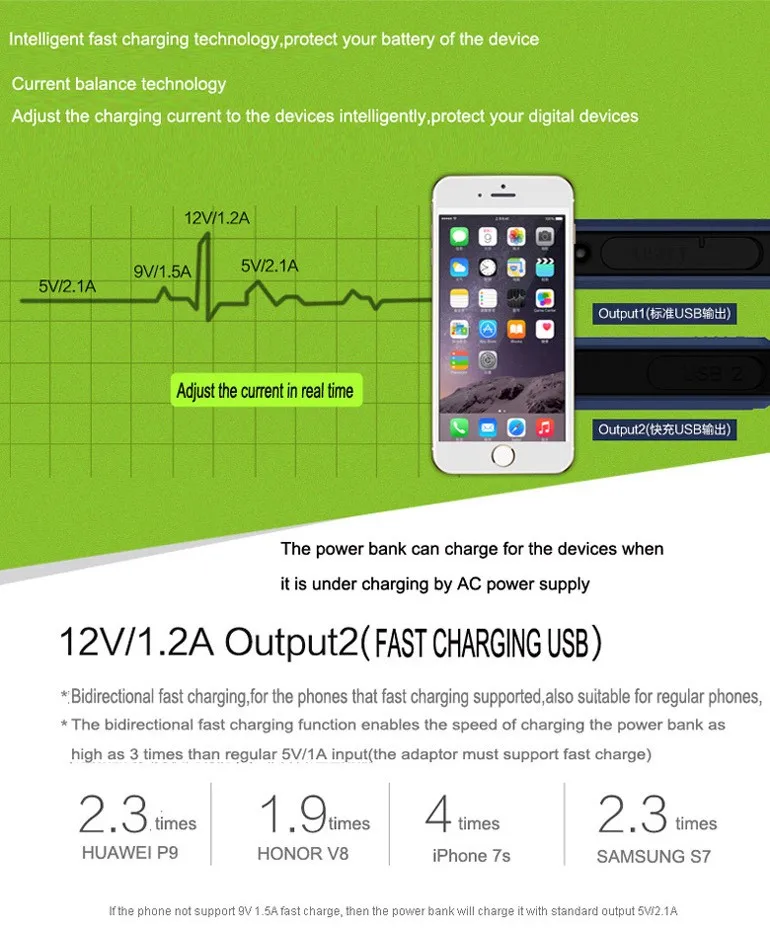 2.Fast charge: Bi-directional fast charge through QC3.0 port . Power of charge/discharge up to 18W, which is 3 times of regular charging manner.
